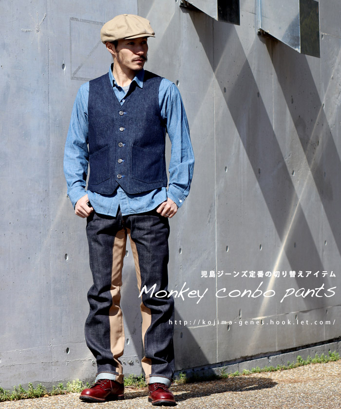岡山 国産 メンズ ワーク デニム カツラギ ボトムス メンズファッション 切替え ベージュ アメカジ 児島ジーンズ Kojima Genes モンキー コンボ パンツ ヘリンボーン Ilmondodiadriano It